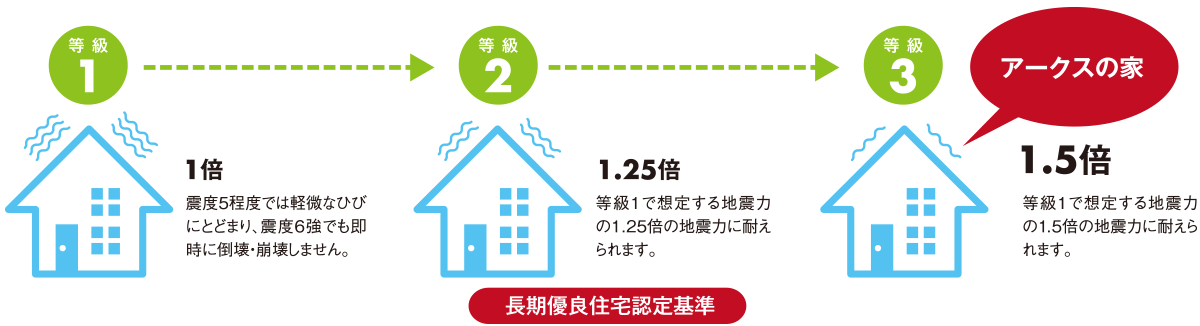 耐震等級3は、耐震等級1の1.5 倍の耐震性を備えています。壁の強度を上げて量を増やし、床の剛性も高めています。また、地震保険料も大幅に割引されます。
