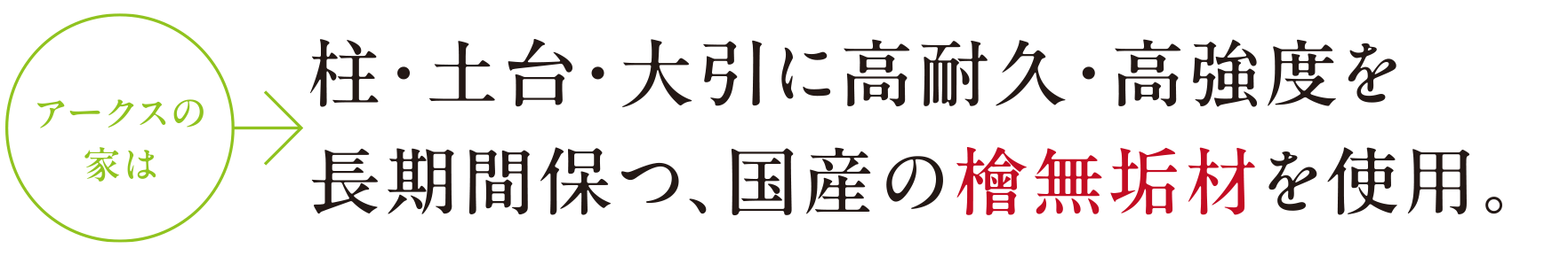 従来の無垢柱材には、乾燥による割れを防ぐため背割りを入れるのが一般的でしたが、アークスが使用する無垢柱材は、いっさい背割りを必要としない画期的な技術から生まれた乾燥材です。従来の無垢材の欠点を克服し、含水率と強度は日本農林規格に基づいて表示を行い、品質・耐久性を大幅に改良しました。