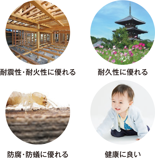 檜は伐採してから200 年は強くなり続けます。奈良の法隆寺は1300 年以上も前の檜のままです。檜だから現在も塔を支えられているのです。 -