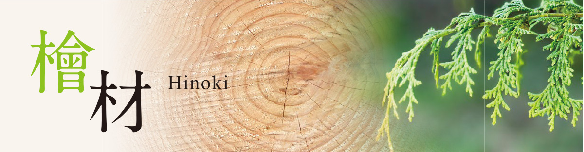 檜は、美しい艶があり、緻密で、独特の芳しさ、しかも他の木材と比べ物にならないほどの強さを持っています。昔から用と美を兼ね備えた最優良材として尊ばれてきました。また、建材全般(特に柱、土台、床板、建具等高級建築など)や家具、化粧単板、細工、彫刻、浴槽、桶、まな板等用途が広いのが特徴です。