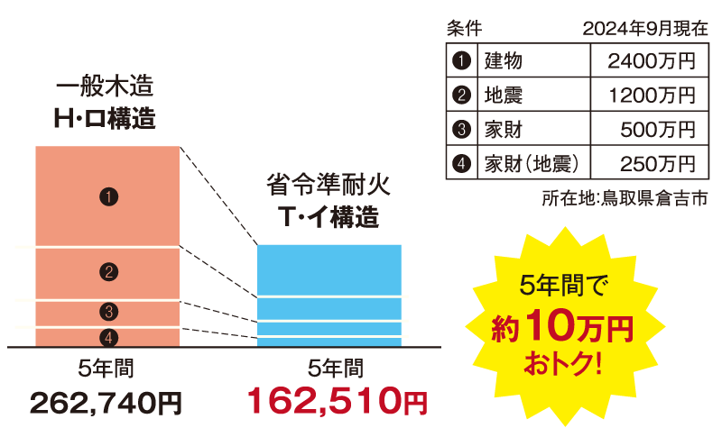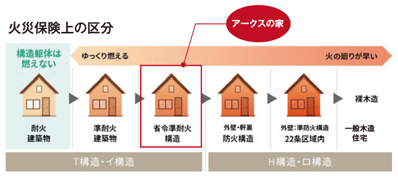 省令準耐火構造の建物は、火災保険の「T構造」の区分に該当し、火災保険料が半額程度に軽減されるとともに、 地震保険の区分も「イ構造」が適用になり保険料は通常の木造の区分(ロ構造)に比べて軽減されています。